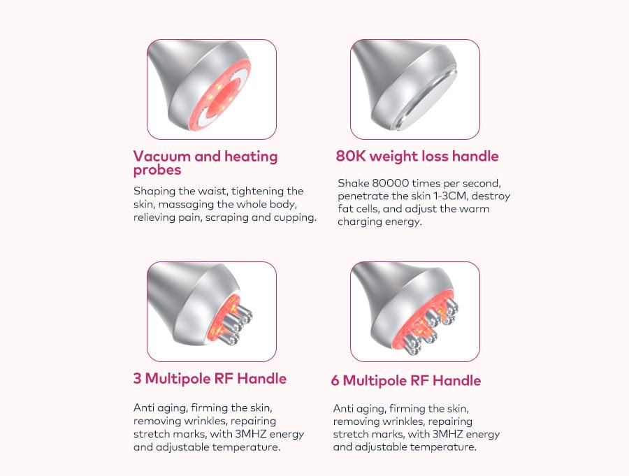 80k Cavitation Head: Zap your fat cells, allows your body's fat cells to erupt, metabolize and can effectively burn calories to achieve fat reduction and cellulite. Targets areas like for abdomen, back, and thighs, resulting in a more sculpted physique.