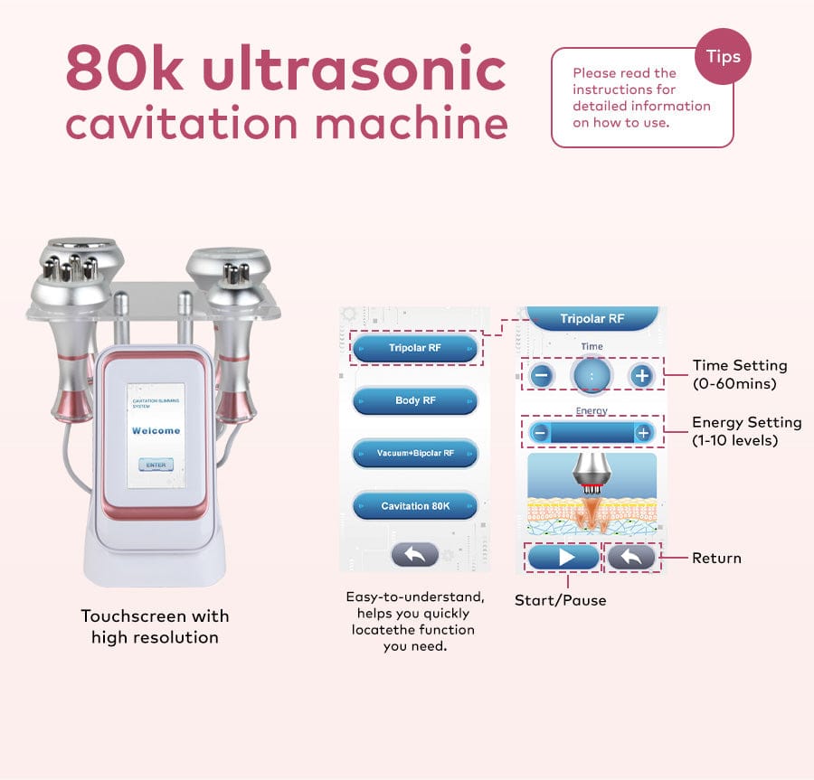 6 Polar Radio Frequency for Body:Help your body metabolize all of those fat cells that were just zapped by ultrasonic cavitation head. Promotes lymphatic drainage & firm skin, enhances skin elasticity. Direct the metabolized fat cells after cavitation. Specifically crafted to tighten loose skin for anti-aging, firming the skin, removing wrinkles, repairing stretch marks.