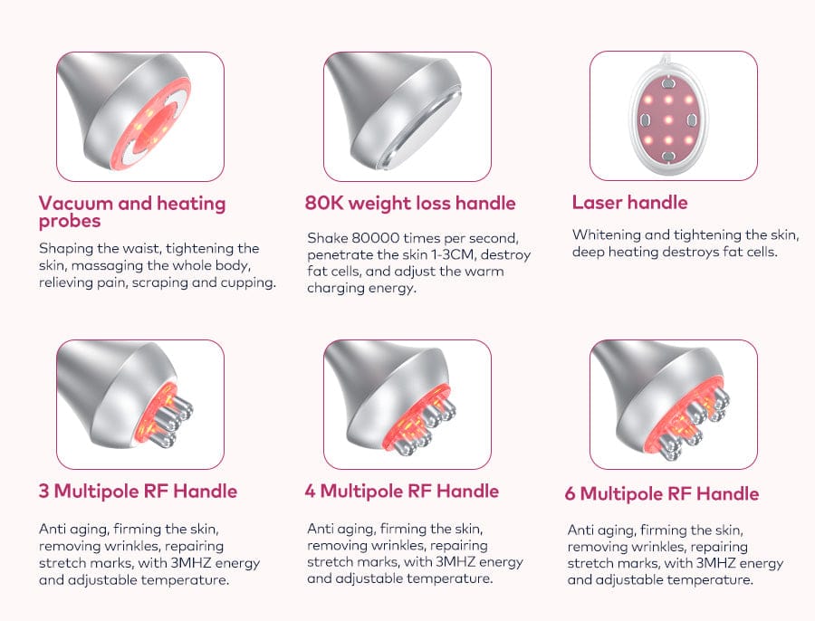 6in 1 Head: Equipped with 6 different massage heads for face, eyes and body, a complete set of programs for all skin types and body parts to meet the needs of body care, skin tightening, fat reduction, metabolism boosting, etc. Further dissolve fat, help to expel the redundant fat and toxin out of body through sweat gland and hepato-enteric circulation