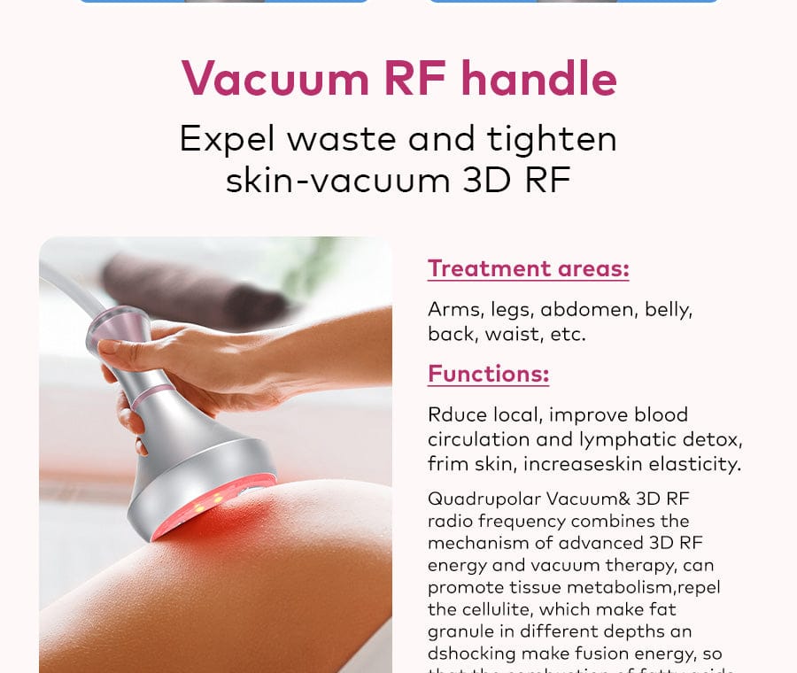 1. Tripolar RF + Hexapole RF: Restores & enhances skin cell regeneration mechanisms, tightens and lifts body skin & facial skin, relieves lumbar discomfort and neck fatigue.