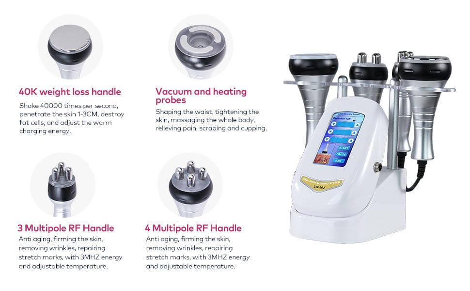 technologies: 40K ultrasonic cavitation, radio frequency, vacuum negative pressure, and 640NM red light wavelength. It effectively reduces fat, tightens skin, and sculpts the face, creating a V-shaped face, and enhancing the curves of the arms, waist, abdomen, and legs.