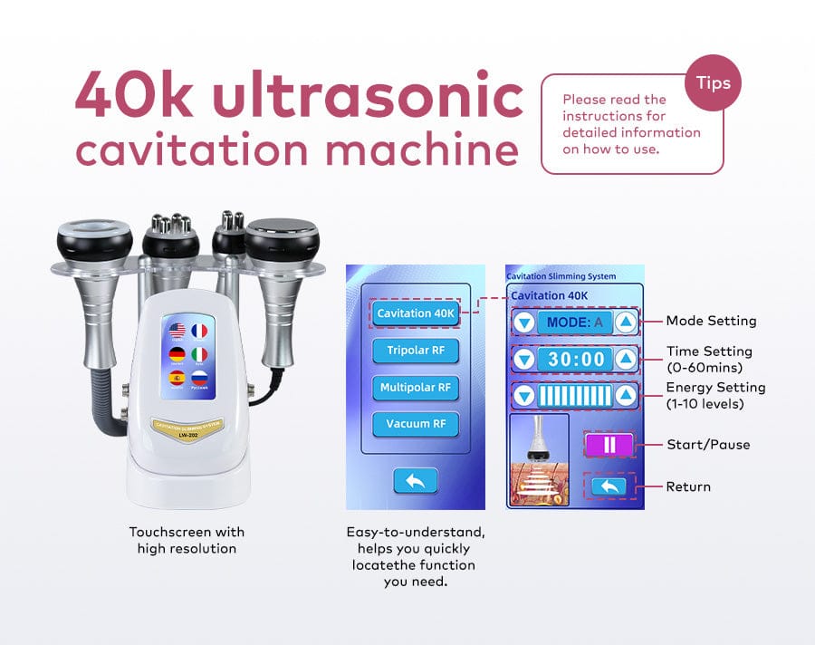1. Ultrasound Waves:The machine emits low-frequency ultrasonic waves (typically between 30 kHz and 40 kHz) that penetrate the skin and reach the subcutaneous fat layer.These waves create microscopic bubbles in the fat cells through a process called cavitation.2. Cavitation Effect:The ultrasonic waves cause the fat cells to vibrate rapidly, creating pressure changes within the cells.This pressure change leads to the formation of tiny bubbles (cavities) in the fat cells.The bubbles expand and eventually implode (collapse), breaking down the fat cell membranes.3. Fat Cell Disruption:Once the fat cell membranes are disrupted, the fat (triglycerides) inside the cells is released into the surrounding interstitial fluid.The released fat is then metabolized and eliminated by the body's lymphatic system and liver.4. Natural Elimination:The broken-down fat is processed as waste and expelled from the body through natural metabolic processes, primarily via urine and sweat.